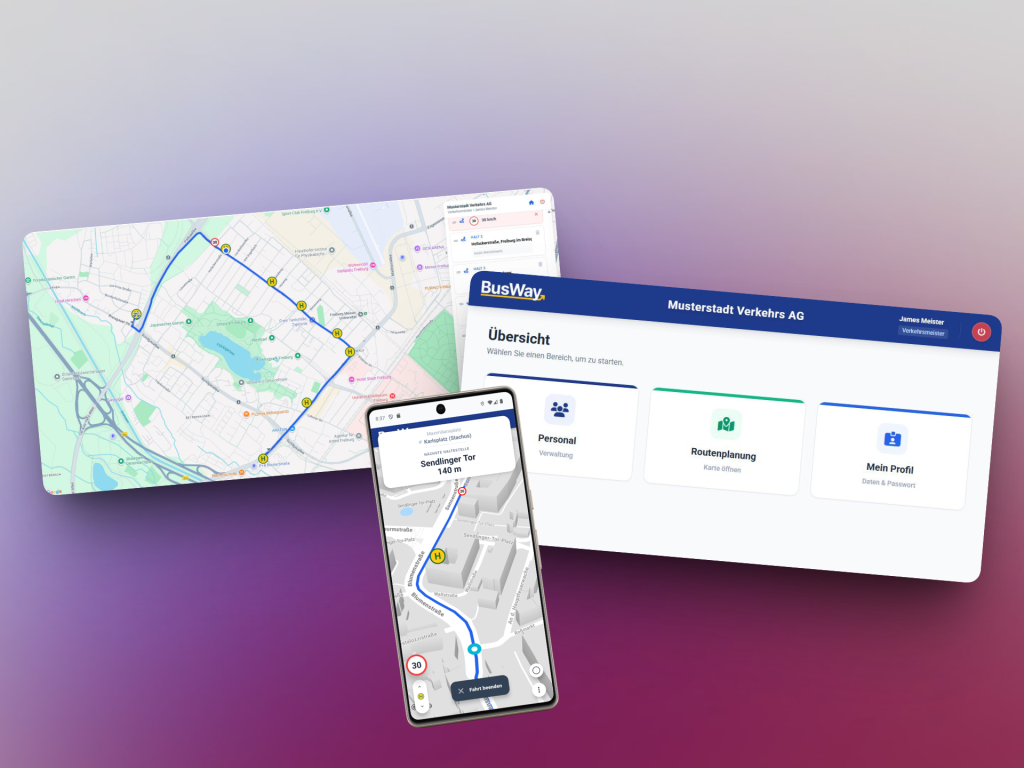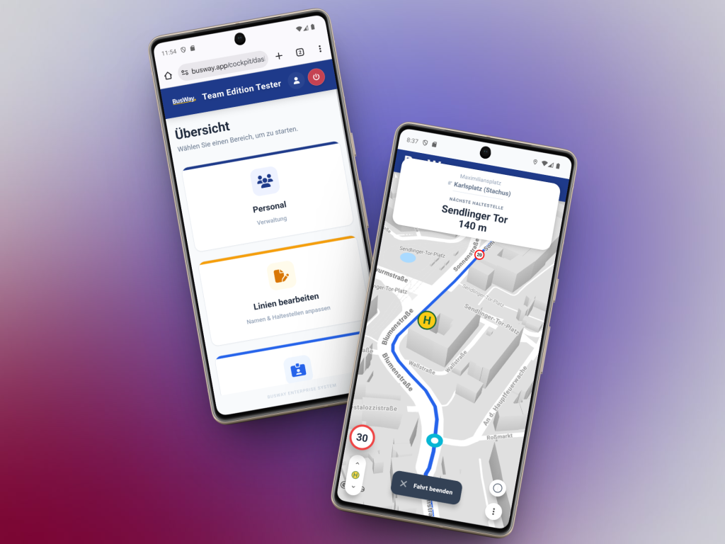 - BusWay Enterprise mit Web-Dashboard und Editor für Busunternehmen und Verkehrsbetriebe mit kostenloser App für alle Fahrer
